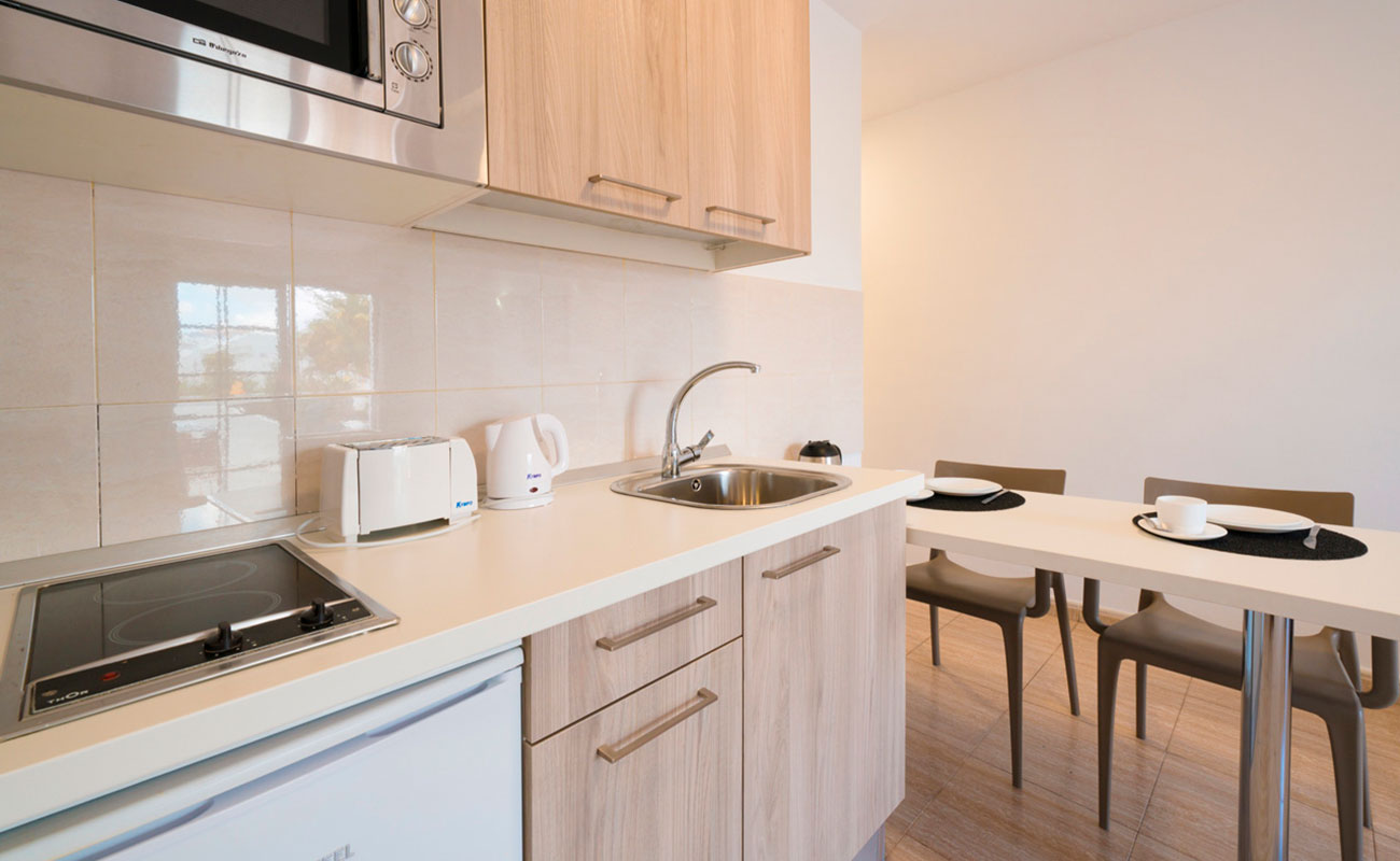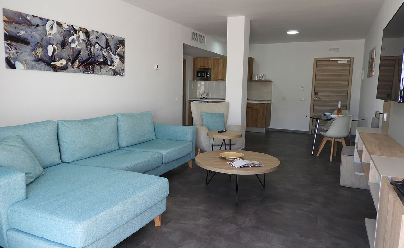Disfruta de una luminosa sala de estar con sofá cama, televisión y teléfono, perfecta para relajarte después de un día de playa. La cocina está completamente equipada con microondas, cafetera, hervidor de agua y todos los utensilios necesarios para que puedas preparar tus comidas con total comodidad.